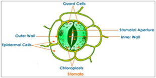 Structure of stomata: Each stomata is composed of two bean-shaped structure called guard cells. In grasses the guard cell is dumbbell shaped. The inner walls of guard cells are thick, while the outer walls are thin. The guard cells are surrounded by subsidiary cells. These are the specialised epidermal cells present around the guard cells called the subsidiary cells.