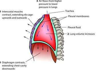 The diaphragm and the set of intercostal muscles aid in the process of inspiration. The diaphragm contracts, thus increasing the volume of the thoracic cavity in the antero-posterior axis. The intercostal muscles also contract and lifts the ribs up further increasing the volume in the dorso-ventral axis. This creates a negative pressure in the lungs with respect to the atmospheric pressure. The air rushes in to equalise the pressure.