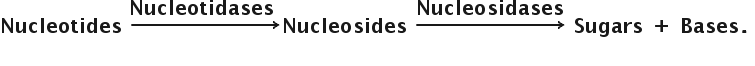 Digestion of nucleotides : Nucleotides are digested in jejunum-ileum. The intestinal juice contains nucleotidases and nucleosidases.