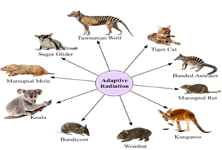 The process of evolution that starts from a single point and radiates in different directions is called adaptive radiation. For example the evolution of marsupials of Australia, each different from one another evolved from a common ancestral stock is found within the Australian island.