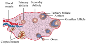 Draw a sectional view of human ovary and label the different follicular stages, ovum and Corpus luteum.