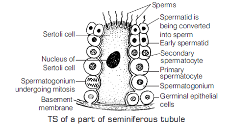 Draw a labelled diagrammatic sectional view of a human seminiferous tubule.
