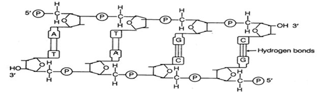 Draw a schematic diagram of a part of double stranded dinucleotide DNA chain having all the four nitrogenous bases and showing the correct polarity.