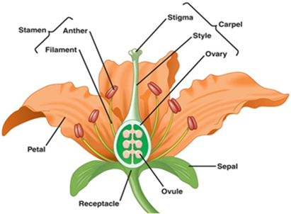iii. Androecium – It is the male reproductive part of a flower. It is composed of stamens. A stamen has a stalk or filament and an anther. Each anther is bilobed, with each lobe having two chambers called the pollen sacs. The pollen sacs have the male gamete or the pollen grains.