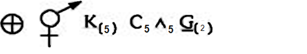Write the floral formula of a actinomorphic, bisexual, hypogynous flower with five united sepals, five free petals, five free stamens and two united carples with superior ovary and axile placentation.