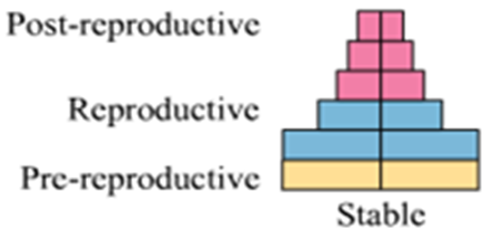 The age pyramid that reflects a stable growth status of human population can be represented as follows: