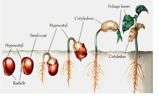 6. Growth of the embryo : On receiving the food the embryo cells metabolise actively. DNA replicates and transcribe RNAs. The cells divide. The radical end enlarges, ruptures the seed coat and passes downward to form primary root which later on forms the root system.The plmule elongates to form the stem, new leaves are formed and cotyledons fall.